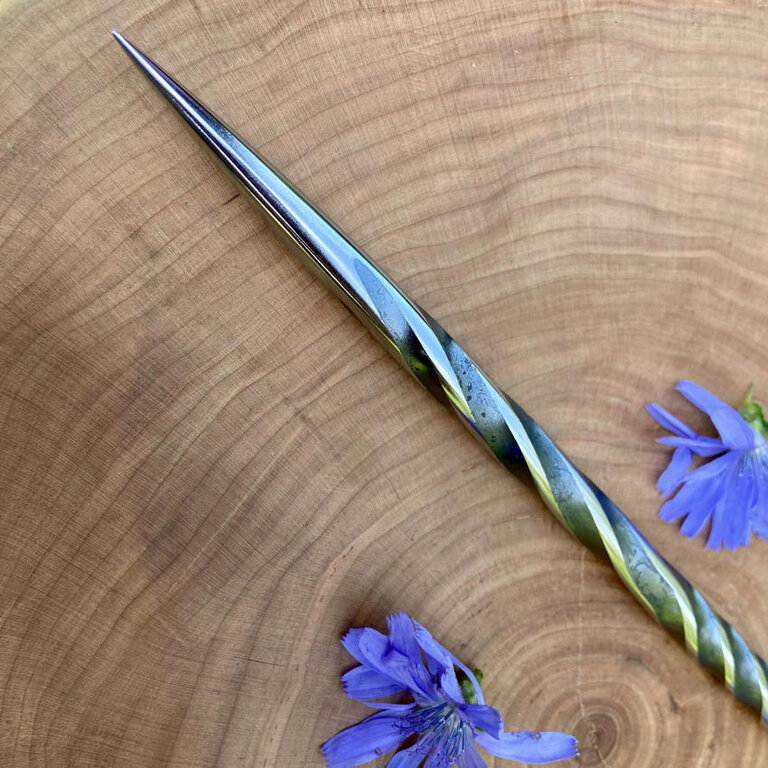 The twists in the wand show the movement of energy. and that magick is always turning about the dark and light side of dualities. The contrast between the shiny polished areas and dark interior of the twists also talk to the ying and yang of the light and dark, the double sided coin that is energy.