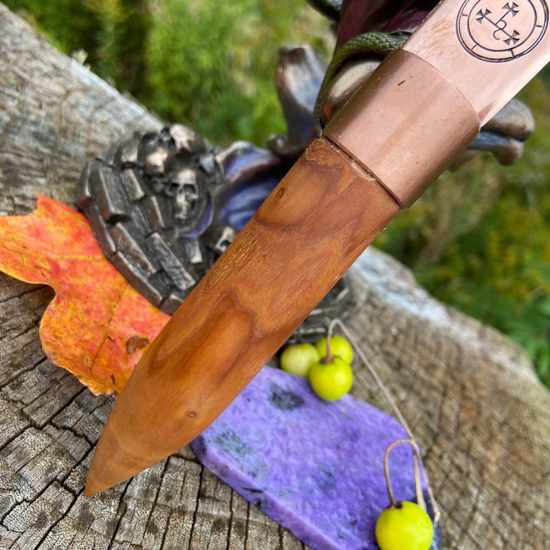 This athame, perfect for traditional witchcraft, ceremonial high magick and wicca was crafted from a single piece of copper bar and stamped with the sigil of Lilith. 10 inches in total length, of which the blade is 4.5 inches.