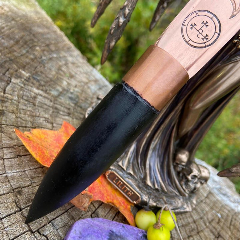 This athame, perfect for traditional witchcraft, ceremonial high magick and wicca was crafted from a single piece of copper bar and stamped with the sigil of Lilith. 11 inches in total length, of which the blade is 6.5 inches.
